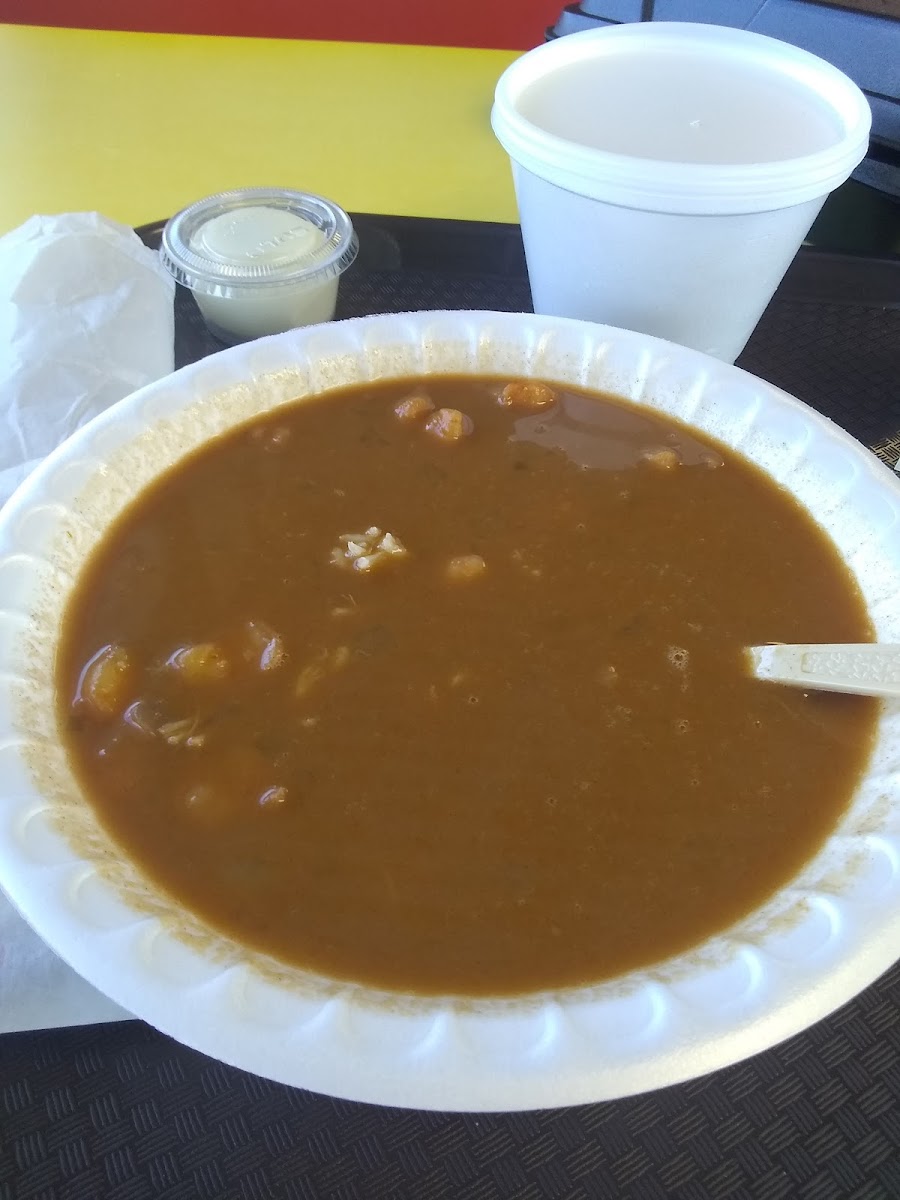 I had a cup of chicken and sausage gumbo. The chicken seemed to be organ meat, which is fine but maybe would take some people by surprise. It was bigger than a snack but smaller than a meal. However it took way too long to be served to me given that it was just a cup of soup. Would go back, though, good place to stop and have a bite